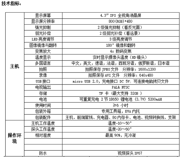 2、6mm雙鏡頭獨有的環境溫度檢測功能,同時檢測環境溫度超過75攝氏度,將自動斷開攝像頭電源,有效保護插入管;
